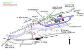 Sowerby Bridge station on the Leeds-Manchester line is under 10 minutes walk away. Trains run about every hour. To walk from the station, use the back (northern) exit. Go down the ramp from either platform, down the steps, cross the road, turn left and almost immediately right onto the path (signed Town Centre) across the river to the main road. Turn right, then follow the towpath.
