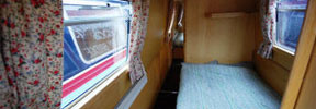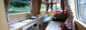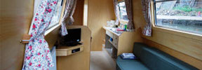 The saloon at the front has an L-shaped settee with a table which can be hidden away when not required. The settee converts either to a double bed or to two singles. There are large drawers under the settee.