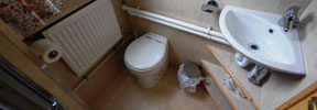 The galley has a fitted cooker with 4-burner hob, oven and grill, fridge, microwave, lots of storage and tiled worktop. The forward toilet has a washbasin and shelf. There is a dividing door in the corridor.