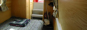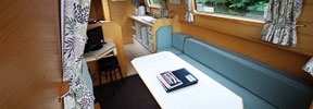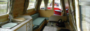The saloon at the front has an L-shaped settee with a table which can be hidden away when not required. The settee converts either to a double bed or to two singles. There are large drawers under the settee.
