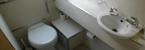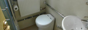 The galley has a fitted cooker with 4-burner hob, oven and grill, fridge, microwave, lots of storage and tiled worktop. The forward toilet has a washbasin and shelf.