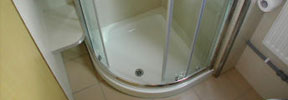 The bathroom has a shower cubicle, toilet, basin with shelves, and radiator. There are dividing doors in the corridor.