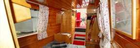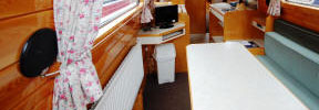 The semi-traditional back end has seating. Radio CD player with 4 speakers, and colour TV/DVD. The front cockpit has seats either side. An inverter proves 240v AC, to power any of your own normal mains appliances up to 1000 watts. There is a mains hair dryer (more powerful than on other boats). The engine is an Isuzu 4-cylinder water-cooled diesel.