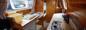 The galley has an inset hob and fitted high-level oven and grill, fridge, microwave, lots of storage and worktop.