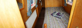The back end is cruiser style with a handrail. The master bedroom has a fixed double bed (our special one-poster design) with sprung mattress, drawers under, a wardrobe, wet locker and airing cupboard. The bathroom has a shower bath, toilet, basin with shelves, and radiator. There are dividing doors in the corridor. The middle bedroom is in two compartments with a dividing door. Each has a fixed single bed, over which an optional top bunk can be fitted. The mattresses are foam covered with cloth. There are drawers and storage under the beds, with shelves and a hanging space. The forward toilet has a washbasin and shelf. The galley has a fitted cooker (with 4 burners, grill and oven), fridge, microwave and lots of storage. The saloon at the front has an L-shaped settee with a table which can be hidden away when not required. The settee converts either to a double bed or to two singles. There are large drawers under the settee. Radio CD player with 4 speakers, and TV/DVD player. The front cockpit has seats either side. An inverter proves 240v AC, to power any of your own normal mains appliances up to 1000 watts. There is mains hair dryer (more powerful than on other boats). The engine is an Isuzu 4-cylinder water-cooled diesel.