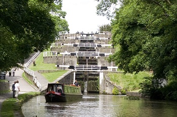 Then join the Leeds & Liverpool Canal which quickly escapes along its own way through fields and woods, with spectacular views of old West Riding industry - particularly Sir Titus Salt's Italianate mills and model town at Saltaire, with its Hockney museum. There are several staircase locks along the way, which culminate in the Five Rise Locks at Bingley, one of the Seven Wonders of the Waterways.